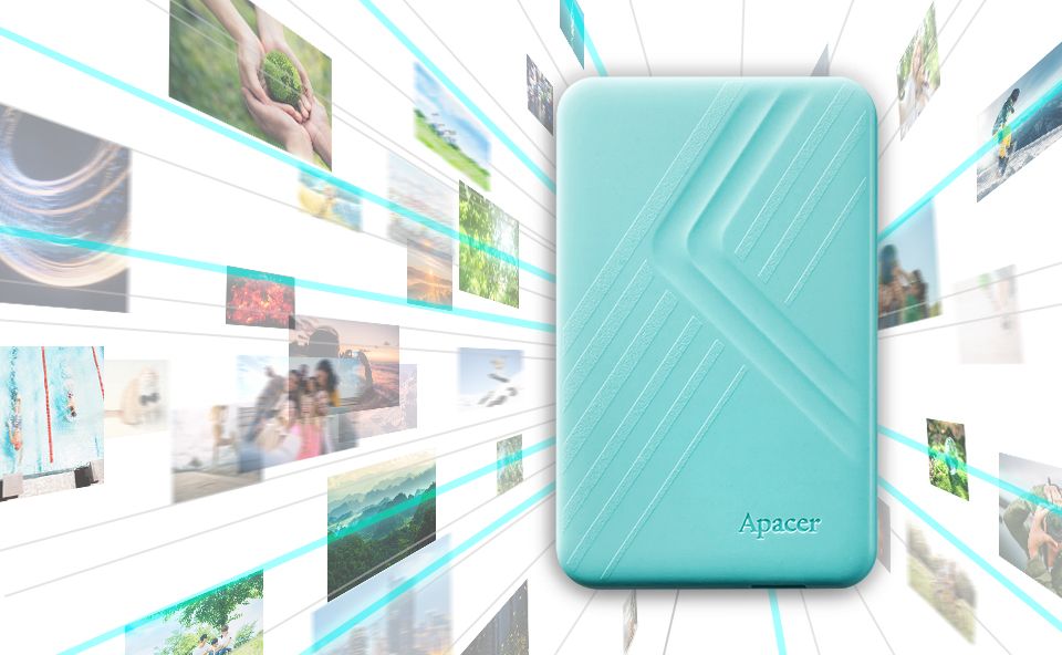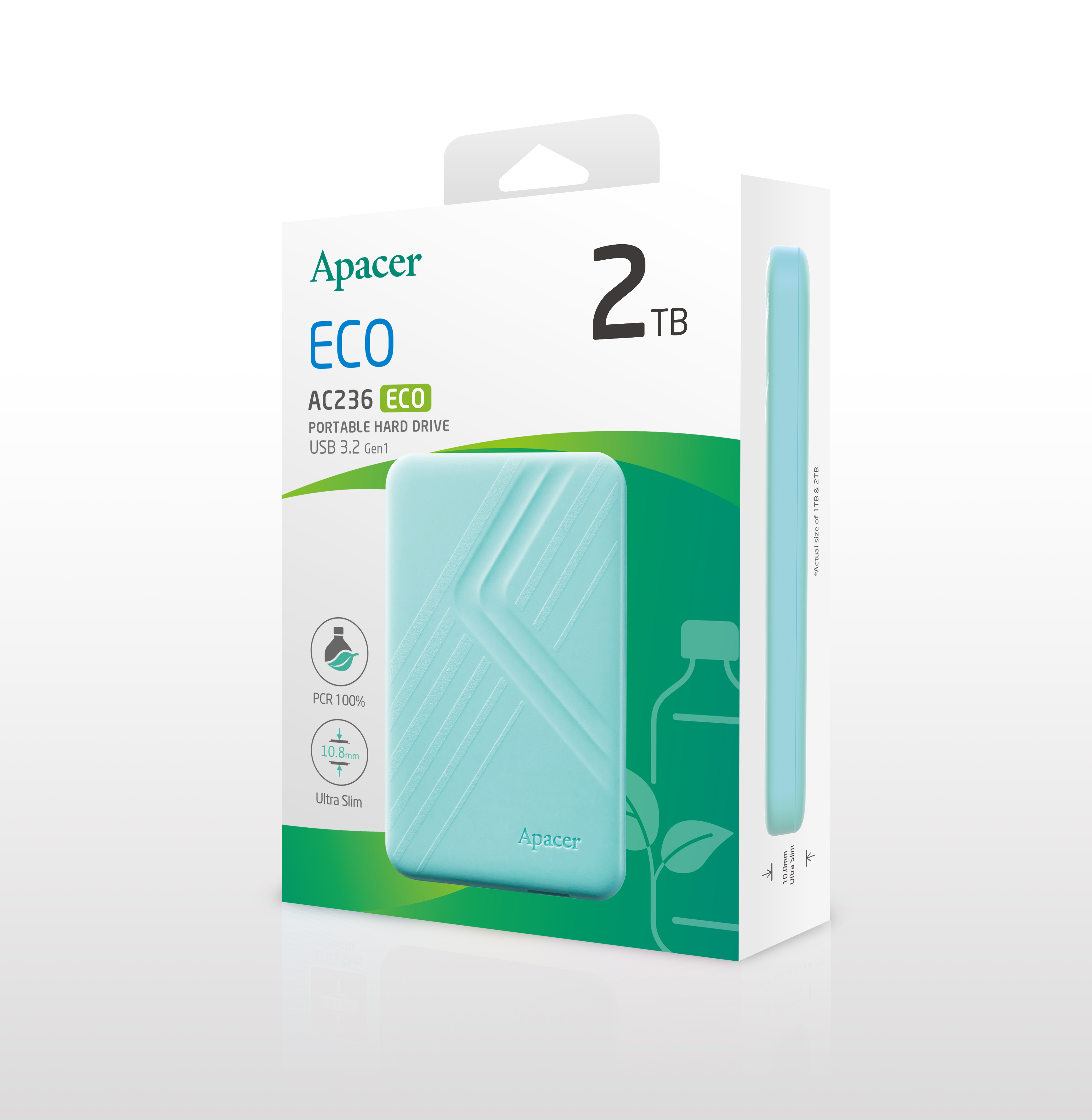AC236 ECO 휴대용 하드 드라이브는 PCR 100%* 재활용 소재로 제작되어 폐기된 플라스틱에 친환경 저장 제품**으로 제2의 생명을 불어넣었습니다.