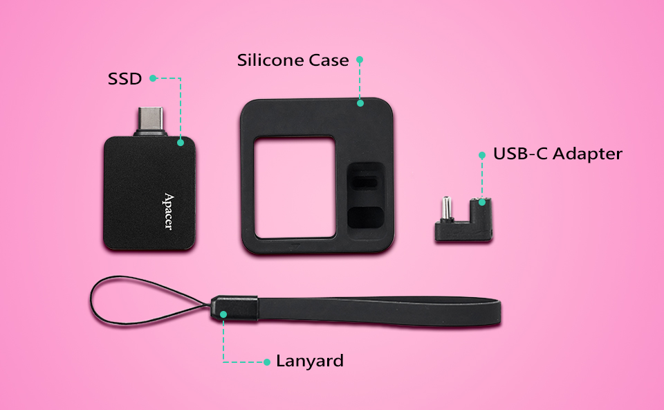 The silicone case holds both the SSD and USB-C adapter, providing full protection and convenience. Take it anywhere—worry-free!