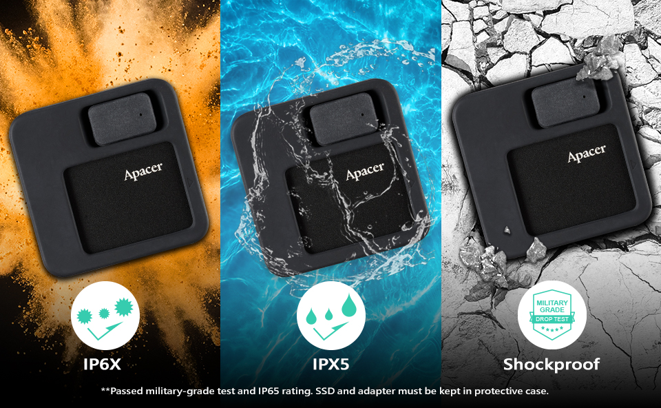 The AS714 survives 1.22m drops and has an IP65 rating, protecting your data from dust, water, and everyday mishaps.